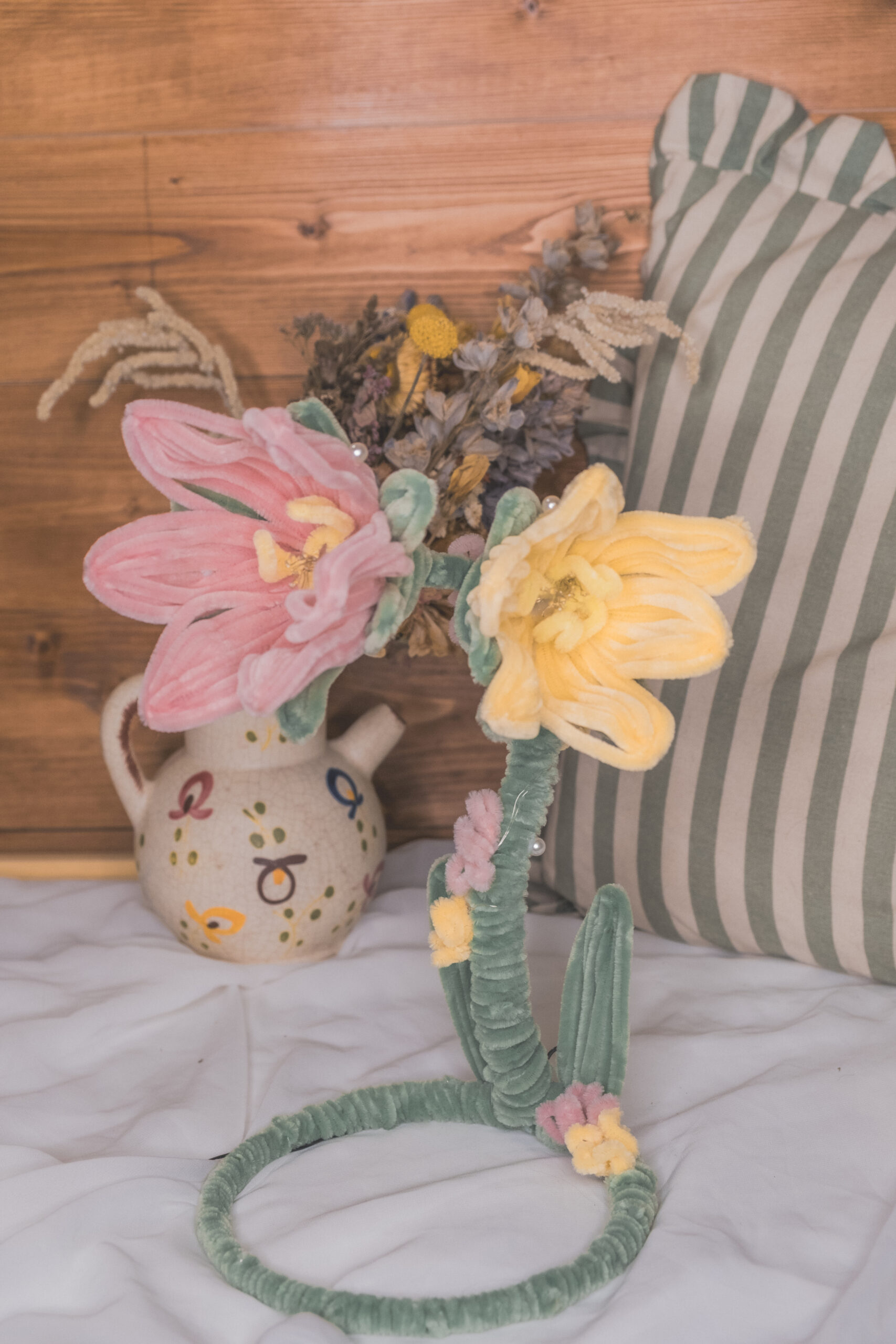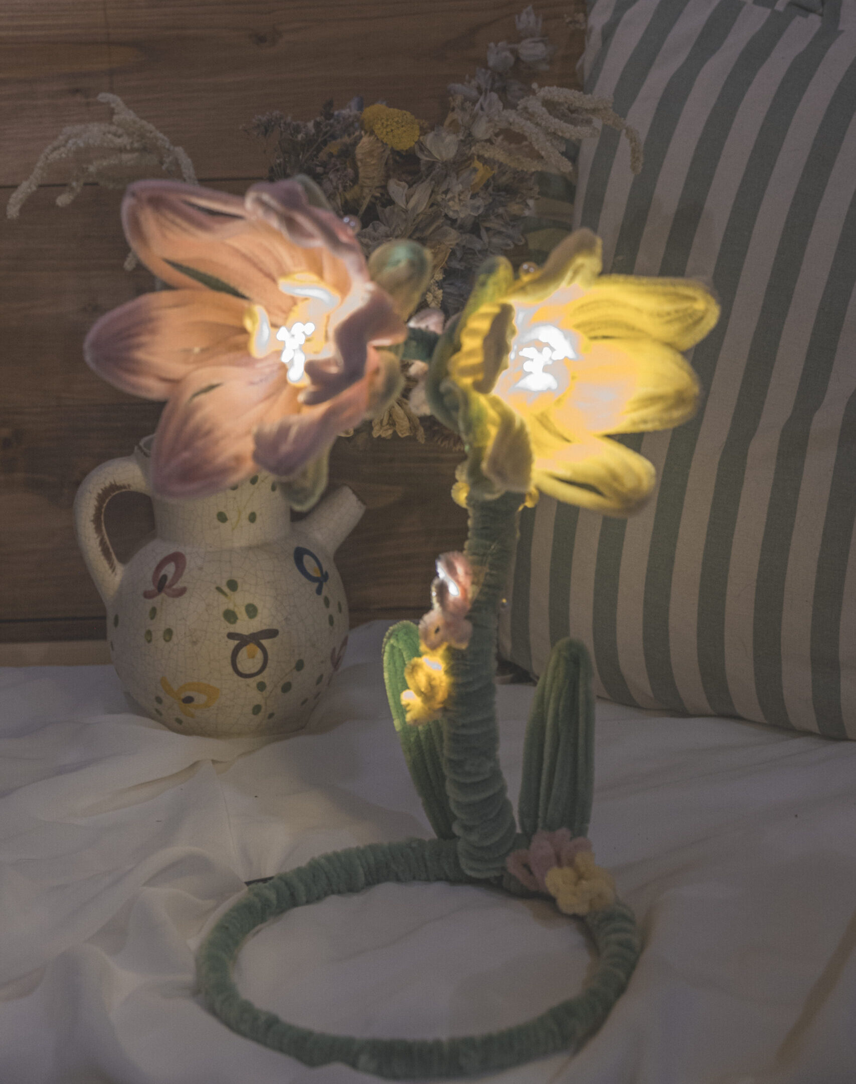 Lampe artisanale composée de fleurs lumineuses en cure-pipe, ambiance douce et nocturne, pièce unique.